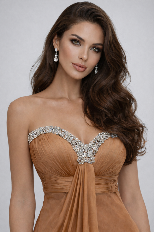 AMBRÉA – Robe de soirée longue camel drapée